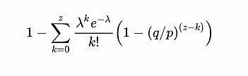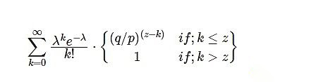 收款人等到此笔交易被打包进区块,并已经有 z 个区块随后被加入。他并不知道攻击者的工作进展究竟如何,但是可以假定诚实区块在每个区块生成过程中耗费的平均时间;攻击者的潜在进展符合泊松分布,其期望值为: