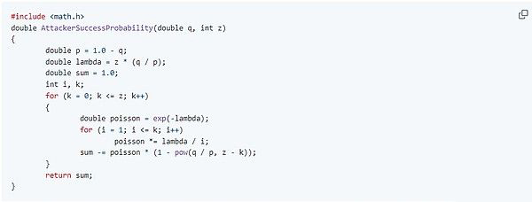 收款人等到此笔交易被打包进区块,并已经有z个区块随后被加入。他并不知道攻击者的工作进展究竟如何,但是可以假定诚实区块在每个区块生成过程中耗费的平均时间;攻击者的潜在进展符合泊松分布,其期望值为: