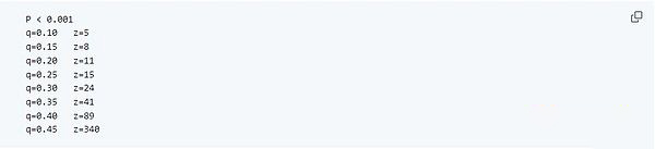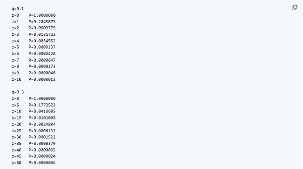 既然我们已经假定p>q, 既然攻击者需要赶超的区块数量越来越多,那么其成功概率就会指数级下降。于赢面不利时,如果攻击者没有在起初就能幸运地做一个前移步刺,那么他的胜率将在他进一步落后的同时消弭殆尽。