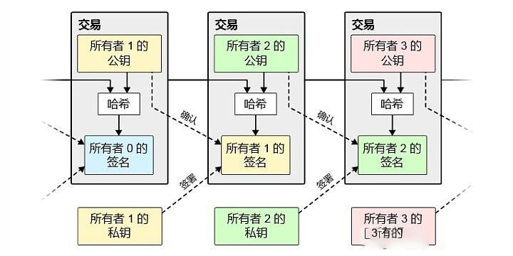 我们将一枚电子硬币定义为一个数字签名链。一位所有者将一枚硬币交给另一个人的时候,要通过在这个数字签名链的末尾附加上以下数字签名:上一笔交易的哈希(hash,音译,亦翻译为“散列值”),以及新所有者的公钥。收款人可以通过验证签名去验证数字签名链的所属权。