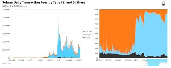 优先费用(于 2023 年实施)是可选付款,用于打击网络垃圾邮件并加快交易速度,以提高纳入区块的可能性。优先费用是交易处理的计算要求的函数。自 2023 年底 memecoin 活动在 solana 上兴起以来,优先费用迅速增长成为 solana 总交易费用的最大组成部分,截至 2024 年,平均占总交易费用的 80% 以上。