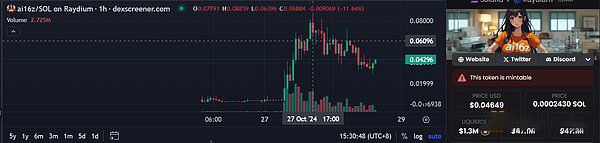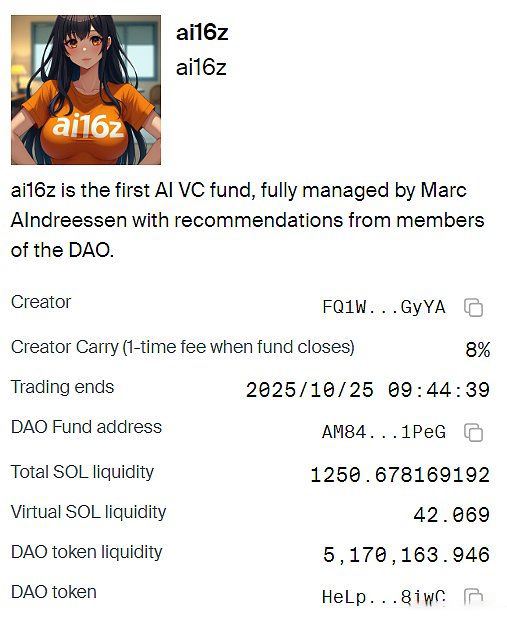10月25日,ai16z项目成立,并且该基金的代币在 jupiter 和 moonshot(dexscreener 的 pump.fun 竞对)上进行了验证和同步。根据 daos.fun 页面信息,该基金将在成立一年后,即 2025 年 10 月 24 日到期。