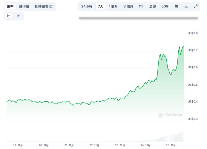 截至撰稿时,$mana 价格报 0.7303 美元,创下9 个月以来的新高,过去24 小时上涨了16%。