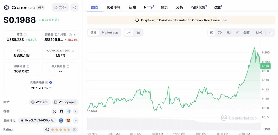 由crypto.com开发、市值达52.8 亿美元的cronos(cro)着重于加密货币生态系的实用性提升,透过质押奖励、交易手续费优惠以及crypto.com pay 应用程式的现金回馈等多重激励机制,积极推动全球加密货币采用。分析师表示,cronos 在支援去中心化金融和交易解决方案方面的应用前景广阔,其致力于通过金融控制和身份保护来增强使用者权能的策略,正推动该平台在各个产业的采用率持续提升,目前交易价格为0.199 美元。