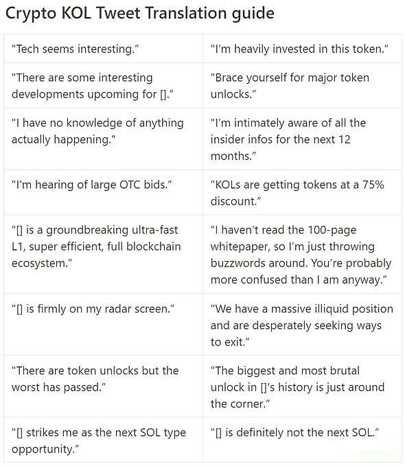 5、otc轮次:虽然 otc 轮次很常见,而且本身并不坏,但它会造成不透明性,因为条款通常不为人知。最大的罪魁祸首是所谓的kol轮次,它们充当代币价格的加速。某些一级 l1(姓名未透露)最近采用了这种做法。很多twitter kol获得了诱人的代币交易,折扣幅度很大(约 50%),归属期很短(六个月内线性),激励他们将代币推广为下一个 [l1] 杀手。如果有疑问,这里有一个方便的kol翻译指南可以帮助你消除噪音。