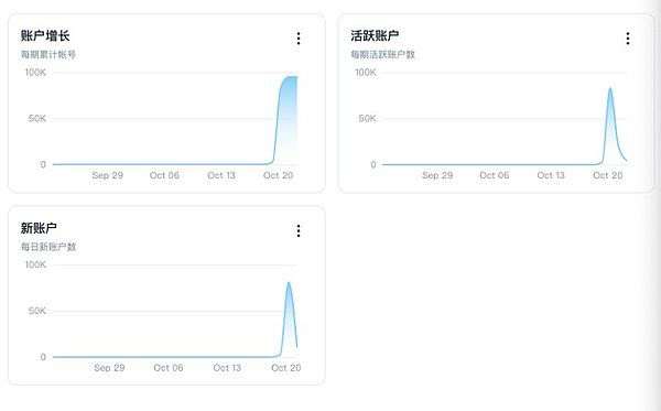 10月20日,是ape express热度最高的时刻,根据ape express自己提供的数据统计可以看到,新用户和活跃用户均在10月20日达到指数级增长,然后就迅速回落。
