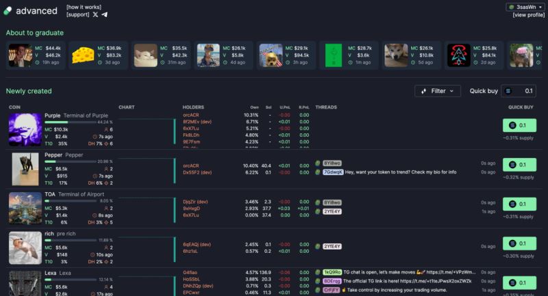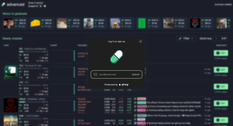 pump.fun advanced 是 pump 推出的最新交易终端,旨在与 photon 和 bull x 等成熟工具竞争。pump advanced 终端针对平台用户进行了优化,将图表、top 持有者统计、高级过滤器、实时更新线程等功能等进行了集成。此外,pump.fun 还允许用户通过身份验证平台 privy,使用非托管钱包通过电子邮件进行登录,前 30 天收取 0% 的费用。