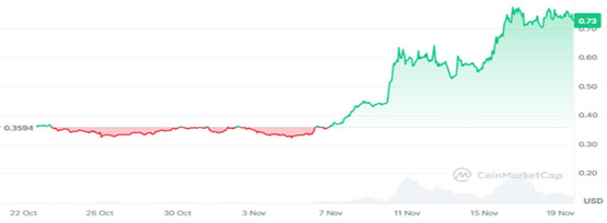 然而,与许多加密货币一样,ada的价格很快就下跌了。整个夏季,ada的交易价格约为0.35美元,略有波动。但当当前的牛市开始时,卡尔达诺的价格翻了一番,达到今天的0.72美元。