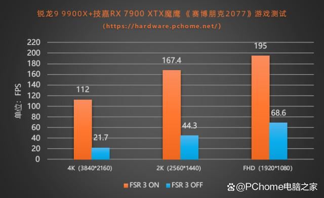 以最新版本的《赛博朋克2077》游戏为例,其加入了fsr 3支持,实测开启fsr 3前后,使用超级光线追踪设置、4k分辨率下游戏帧率最多有多达400%的提升,对于游戏的流畅性可以说是翻天覆地般地提升。