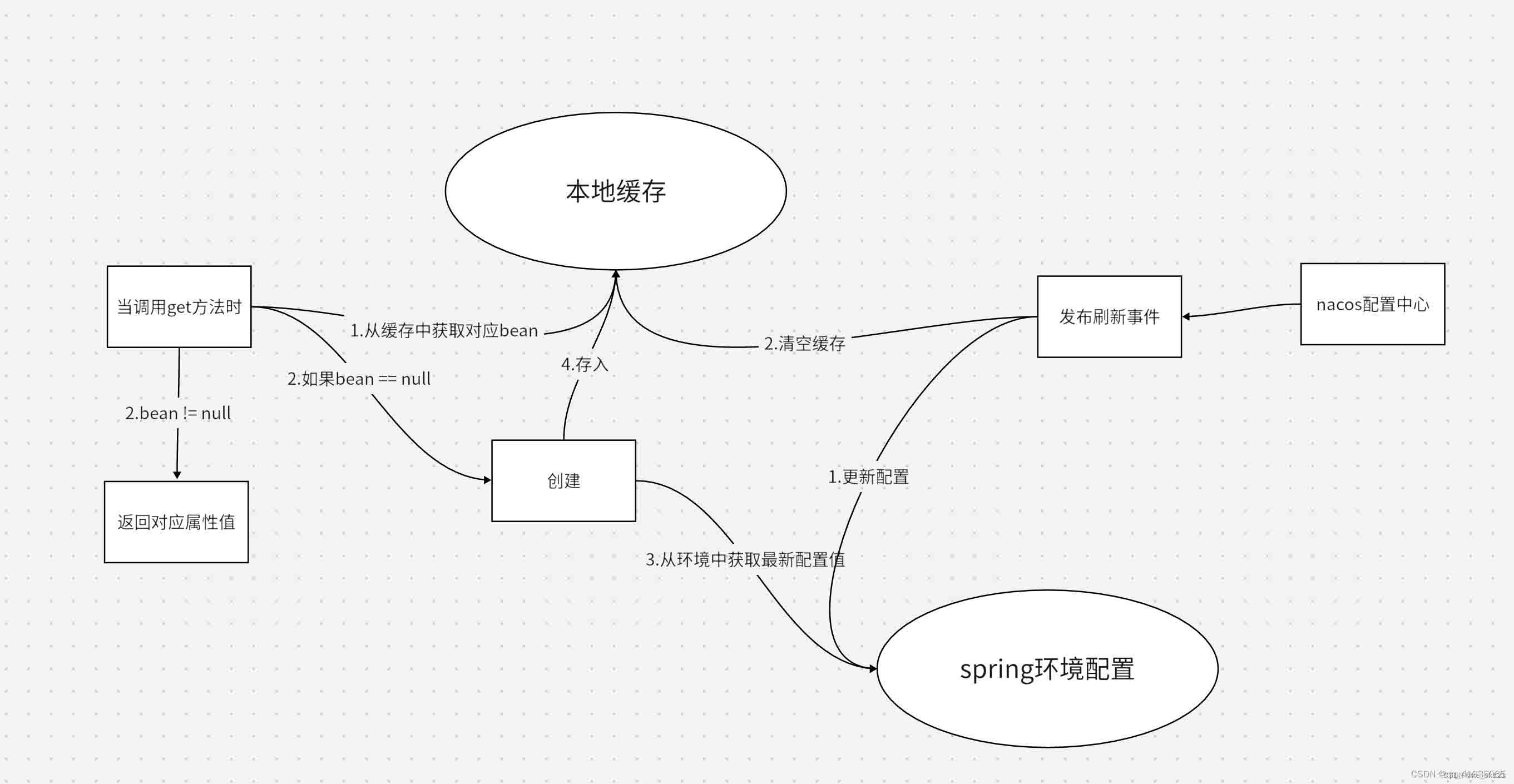- 当调用被@refreshscope注解的bean的属性的get方法时 则先从本地缓存里面获取