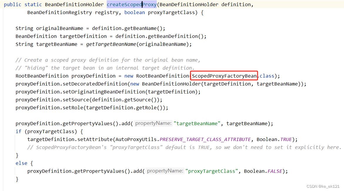 org.springframework.context.annotation.annotationconfigutils#applyscopedproxymode -->org.springframework.context.annotation.scopedproxycreator#createscopedproxy -->org.springframework.aop.scope.scopedproxyutils#createscopedproxy