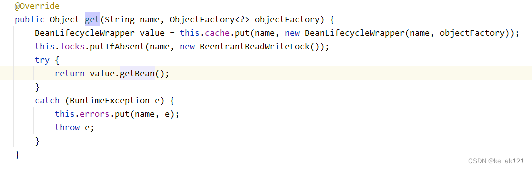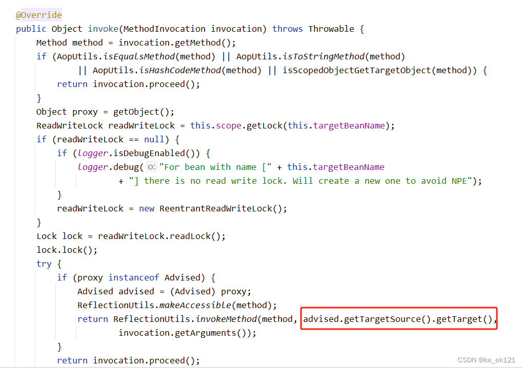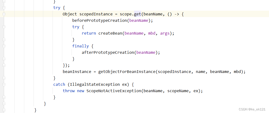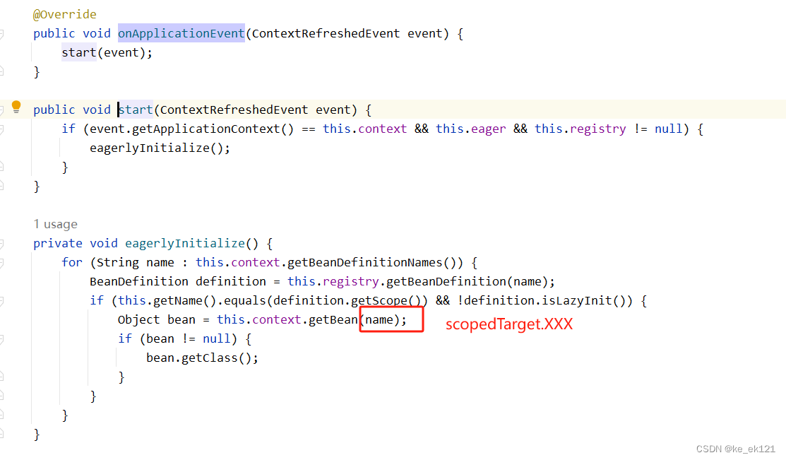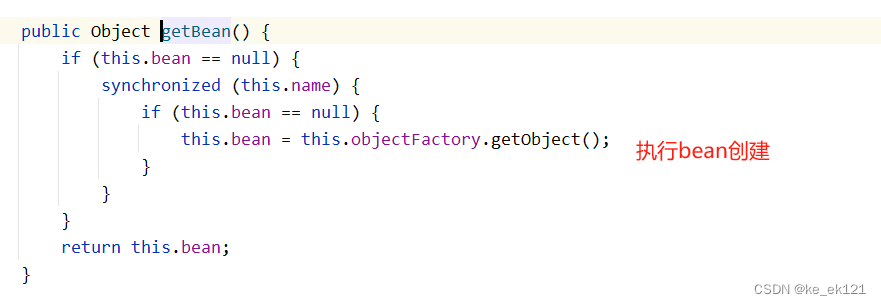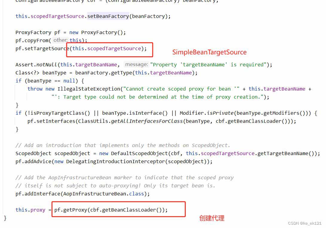 由此调用时就会调用getobject()方法,这样就会得到一个代理对象,执行时会获取到目标对象 simplebeantargetsource.gettarget(),以"scopedtarget."开头的bean,接下来看一下该bean的创建时机