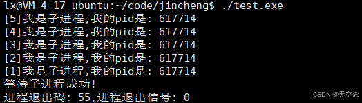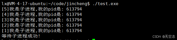 int main() { pid_t id = fork(); if(id<0) { perror("fork"); exit(1); } if(id==0)//子进程代码 { int count = 5; while(count) { printf("[%d]我是子进程,我的pid是: %d\n",count,getpid()); sleep(1); count--; } exit(55);//子进程执行完代码后退出 } //父进程代码 int status = 0; waitpid(id,&status,0); printf("等待子进程成功!\n"); printf("进程退出码: %d,进程退出信号: %d\n",(status >> 8) & 0xff,status & 0x7f); return 0; }