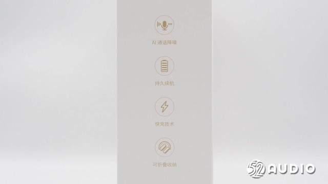 包装盒侧边展示有产品的功能特点:ai通话降噪、持久续航、快充技术、可折叠收纳。
