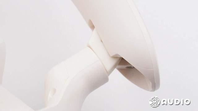 机身侧边外观一览,圆形耳壳设计,经典半月形悬挂,观感非常简洁。耳壳支持上下角度旋转,用于更好的适配不同用户使用。