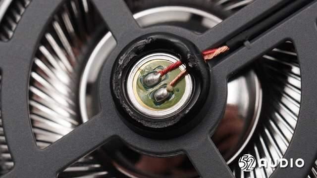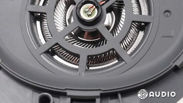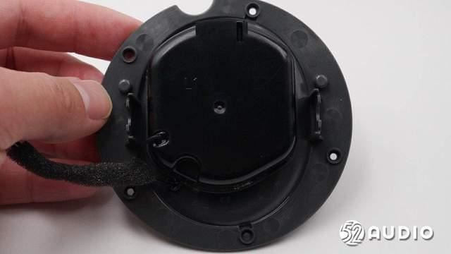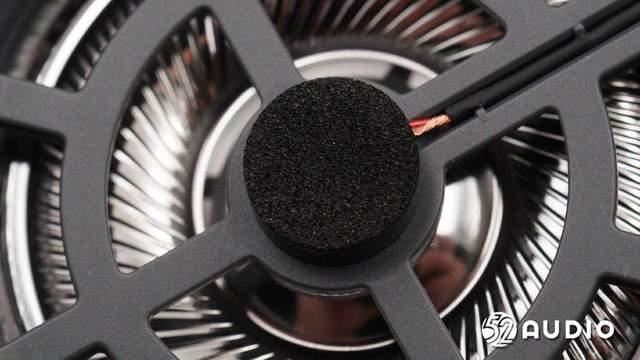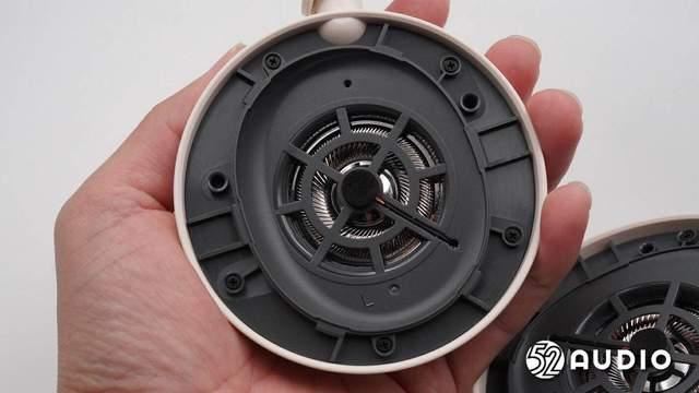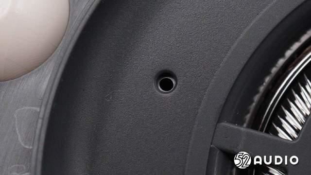 透过出音孔,音腔内部的扬声器特写,采用了镀钛复合振膜。