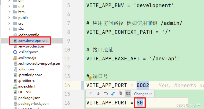 如果你使用的是idea或其他现代前端构建工具,可以在.env.development文件中修改端口号。例如: