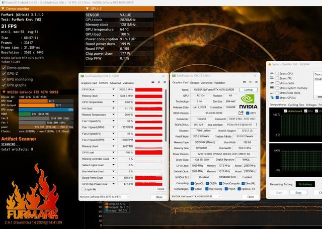 rtx4070 super显卡搭配的是aida64和furmark 2.4.1进行双烤压力测试,实际运行7分钟41秒,正常通过测试,期间无黑屏或是闪屏问题出现,gpu频率也可以保持在2820mhz,对应的功耗是200瓦左右。