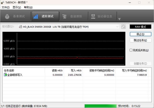 因为是有2gb独立缓存的ssd方案,不会进入垃圾回收阶段,所以wd_black sn850x 2tb版本是两段式速度。在极为短暂的速度波动后,ssd的顺序写入速度会稳定在1600mb/s左右直至全盘写入完成,结束时为第16分01秒。