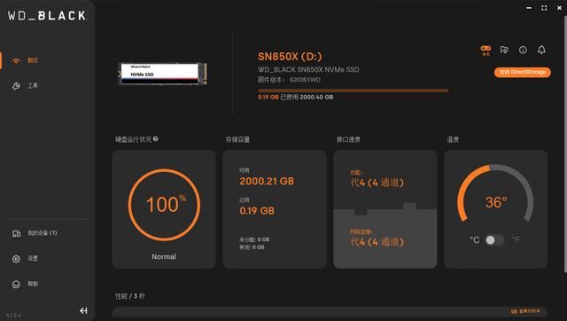 在western digital dashboard控制面板中,我们可以很清楚看到硬盘的健康度,容量,pcie运行版本,硬盘温度等关键数据(就是这个机翻还是找人润色下吧。。。)。