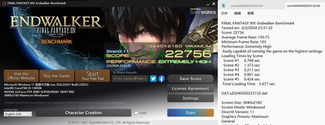 这里,我们用免费的《最终幻想14》的benchmark进行测试,它是市面上少有的能够直观显示游戏加载时间的benchmark,这款benchmark无需安装,将其复制到对应的固态硬盘上即可运行测试,本次测试游戏分辨率为4k,画质为预设最高。