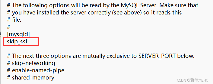 注意:是在[mysqld]下面添加 skip_ssl 记住是 skip_ssl ,不要忘记下划线!!!