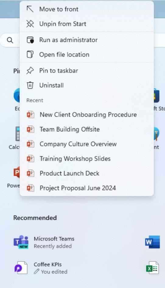 用户右键单击固定到开始菜单的应用程序后,具有跳转列表(jump list)的应用程序(例如 powerpoint)将显示跳转列表。