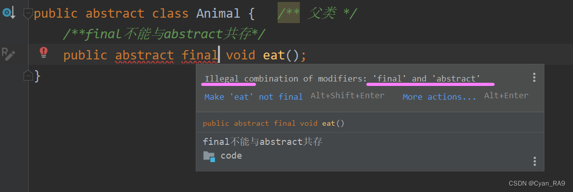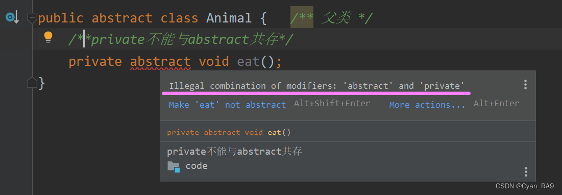 如果你固执己见,非要让abstract和这几个关键字一同出现,idea也是毫不客气,直接报错,如下图所示 :