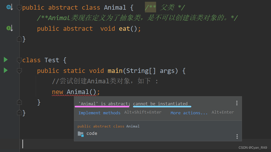 还要注意一点,如果某个类中已经出现了抽象方法,那这个类必须定义成抽象类,否则会报错,如下gif动图演示——我们删掉animal类前的abstract修饰符,idea立马就会给出提示信息,如下 :
