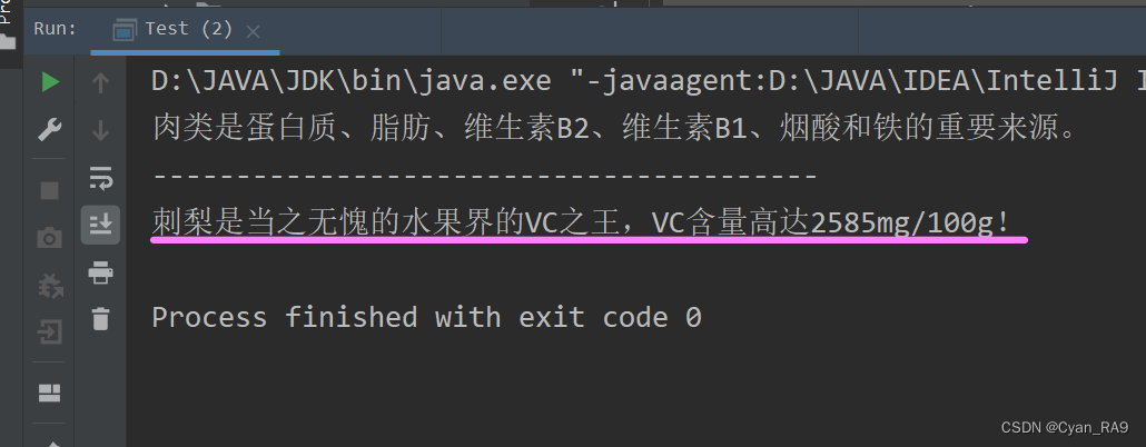 我们也可以再定义一个cili类表示水果中的刺梨,然后让刺梨类去继承fruit类,并在cili类中去实现shownutrition() 方法;fruit类不变,test类和cili类代码如下 :