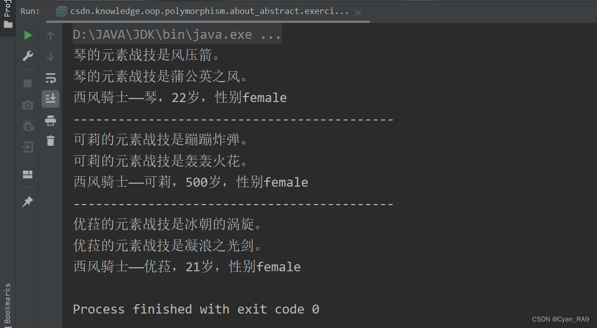 已知西风骑士团的三位骑士分别是琴,可莉和优菈,请分别定义类来描述它们,要求给出每一个西风骑士的姓名,年龄和性别;并且,这三人均可以使用元素之力,分别是元素战技和元素爆发,但每位骑士的战技和爆发都不一样。其中,琴使用风元素,元素战技为风压箭,元素爆发为蒲公英之风;可莉使用火元素,元素战技为蹦蹦炸弹,元素爆发为轰轰火花;优菈使用冰元素,元素战技为冰朝的涡旋,元素爆发为凝浪之光剑。请在这些类中正确选择一个类定义成抽象类,并在该类中定义抽象方法elemental_kill() 和 elemental_burst(),要求这两个抽象方法将来在实现时,需要在控制台打印出当前骑士的元素战技和元素爆发;并在该抽象类中定义非抽象方法,要求该方法可以在控制台打印出当前骑士的基本信息。