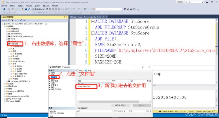 修改数据库stuscore增加次要文件stuscore_data2,存储位置'盘符\...\stuscoredata',初始大小20mb,最大容量2gb,按照10%自动增长,放到stuscoregroup文件组中。