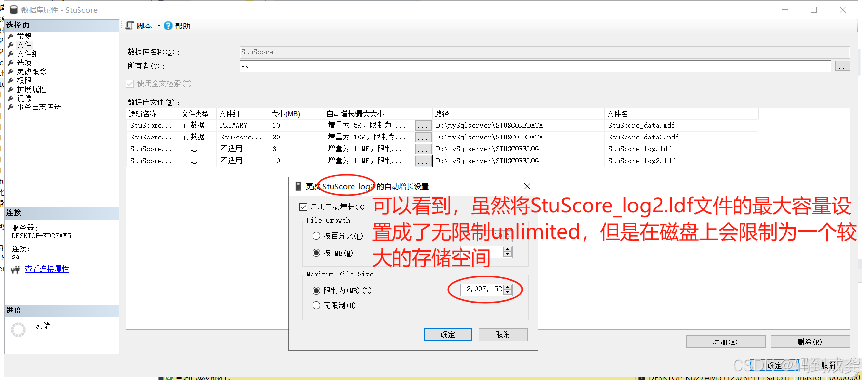 日志文件名:stuscore_log2,存储位置'盘符\...\stuscorelog',初始大小10mb,不限制最大容量(unlimited,不限制),按照1mb自动增长。