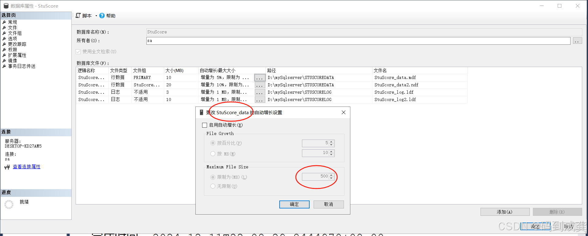 要求:将主数据文件stuscore_data的最大容量设置为500mb。