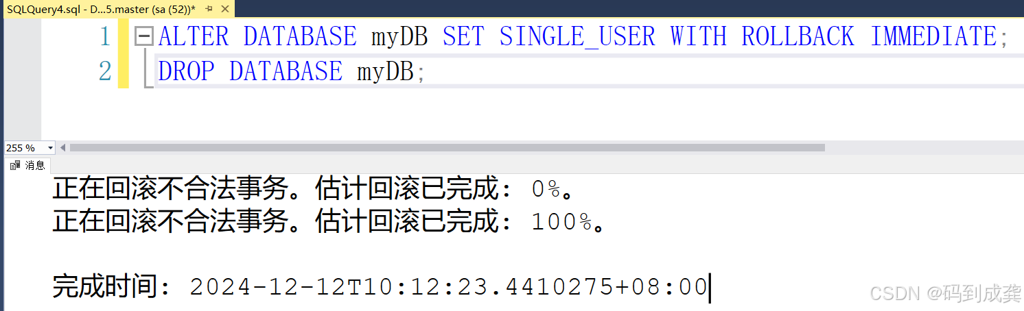 我就是用上面两种方法删除数据库stuscore,如果使用上述两种方法还是无法删除数据库,接下来就需要将数据库设置为单用户模式,断开所有连接,并删除数据库