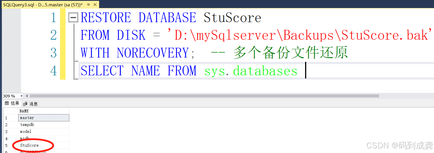 restore database stuscore from disk = 'd:\mysqlserver\backups\stuscore.bak' with norecovery; -- 多个备份文件还原 select name from sys.databases