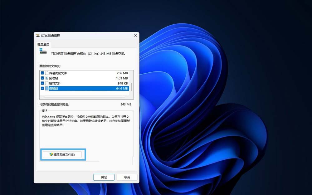 2、在列表中勾选需要清理的项目,特别是「缩略图」,然后点击「清理系统文件」按钮。