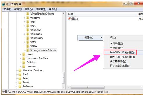 5、选中“toragedevicepolicies项,在右边新建的“dword值”将其命名为“writeprotect”。