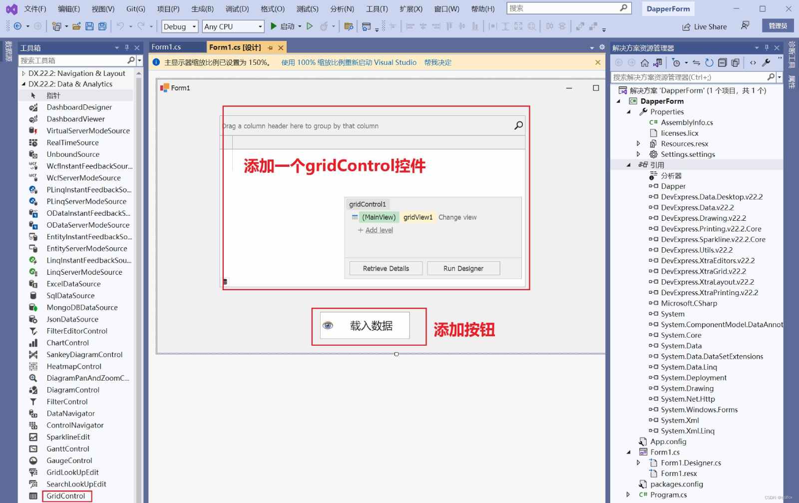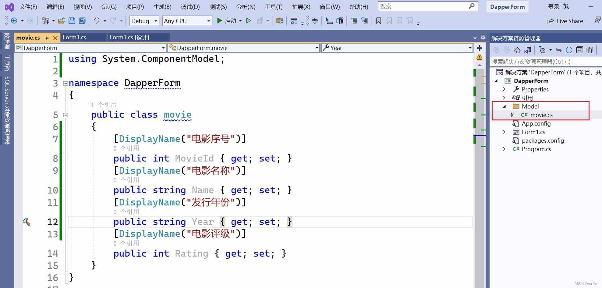}首先定义了一个链接字符串,单连载入数据按钮后,使用dapper的接口连到数据库并打开数据库,然后使用查询语句查询出数据,并将查询结果保存到result变量中,这个变量其实是一个movielist,最后将这个变量放入到控件gridcontrol中。