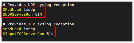 2.编辑“/etc/rsyslog.conf”取消红框部分内容的注释