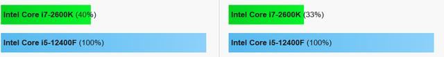 core i7-2600k是英特尔于2011年所发布的一款中高处理器,在当年非常受欢迎。但是,现在毕竟13年过去了,它已“老态龙钟”。其单核性能大约相当于core i5-12400f的40%,多核性能的33%,请参阅下图。