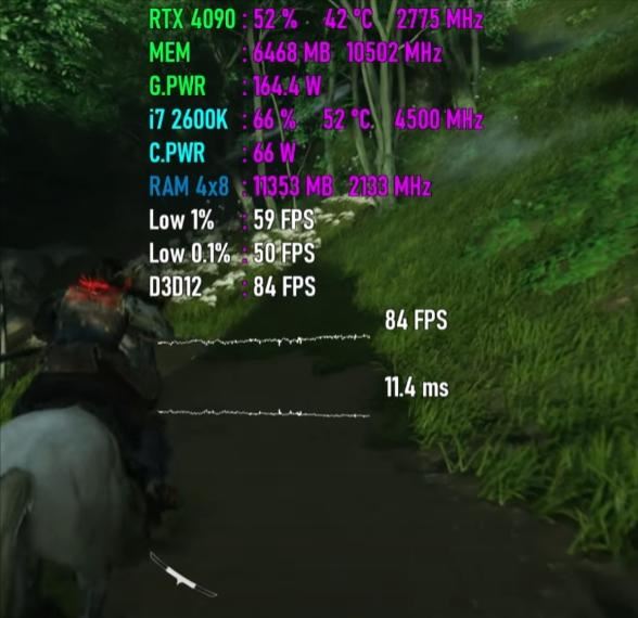 平均帧速为84 fps,最低瞬时帧速为59 fps,帧时间为11.4ms,cpu使用率为66%,功耗为66w,温度为52度,内存使用量为11.4gb,gpu使用率为52%,显存使用量为6.5gb,功耗为164w,温度为42度。