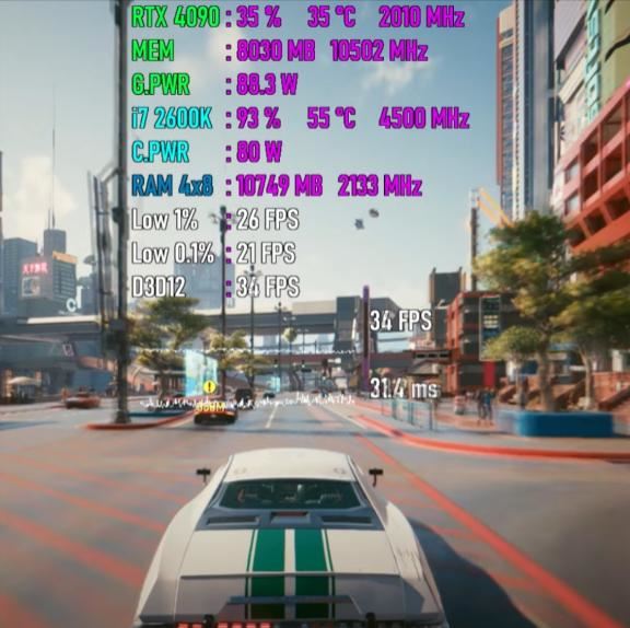 平均帧速为34 fps,最低瞬时帧速为26 fps,帧时间为31.4ms,cpu使用率为93%,功耗为80w,温度为55度,内存使用量为10.7gb,gpu使用率为35%,显存使用量为8.0gb,功耗为88w,温度为35度。