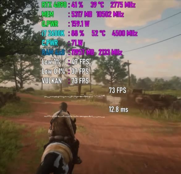 平均帧速为73 fps,最低瞬时帧速为47 fps,帧时间为12.8ms,cpu使用率为88%,功耗为71w,温度为52度,内存使用量为12.0gb,gpu使用率为41%,显存使用量为5.3gb,功耗为159w,温度为39度。