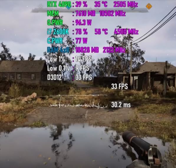 平均帧速为33 fps,最低瞬时帧速为14 fps,帧时间为30.2ms,cpu使用率为78%,功耗为77w,温度为58度,内存使用量为18.8gb,gpu使用率为39%,显存使用量为7.6gb,功耗为96w,温度为35度。