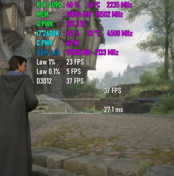 平均帧速为37 fps,最低瞬时帧速为23 fps,帧时间为27.1ms,cpu使用率为54%,功耗为60w,温度为53度,内存使用量为19.5gb,gpu使用率为40%,显存使用量为10.5gb,功耗为107w,温度为36度。