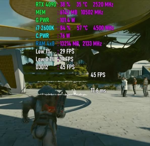 平均帧速为45 fps,最低瞬时帧速为29 fps,帧时间为17.6ms,cpu使用率为84%,功耗为76w,温度为57度,内存使用量为13.2gb,gpu使用率为38%,显存使用量为6.1gb,功耗为101w,温度为35度。