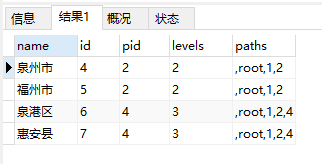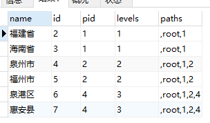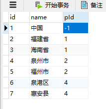 -- 创建测试表 -- drop table if exists `test_tree`; create table `test_tree` ( `id` varchar(10) default null, `name` varchar(10) default null, `pid` varchar(10) default null ) engine=innodb default charset=utf8; -- 创建测试数据(根节点默认-1) insert into `test_tree` values ('1', '中国', '-1'); insert into `test_tree` values ('2', '福建省', '1'); insert into `test_tree` values ('3', '海南省', '1'); insert into `test_tree` values ('4', '泉州市', '2'); insert into `test_tree` values ('5', '福州市', '2'); insert into `test_tree` values ('6', '泉港区', '4'); insert into `test_tree` values ('7', '惠安县', '4');