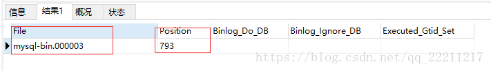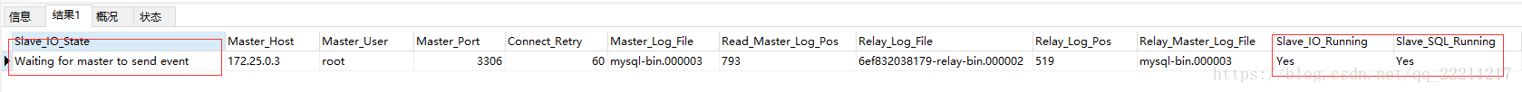 change master to master_host='172.25.0.3', --master的ip 不能为127.0.0.1 master_user='root', --master的帐号密码 master_password='root', master_log_file='mysql-bin.000003', --master 查询的file名 注意上面! master_port=3306, --master 端口 坑!为容器端口 不是主机端口 master_log_pos=596; --日志文件位置 注意上面!
