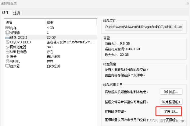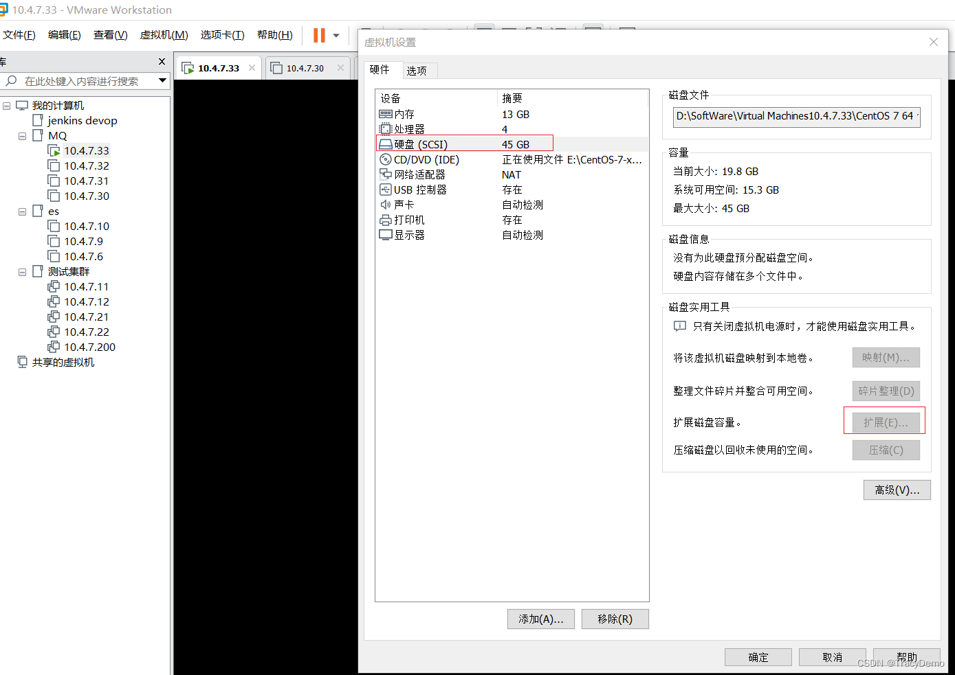 在vmware软件中,选择对应的虚拟机,点击“硬盘”。【需要先关机再操作】
